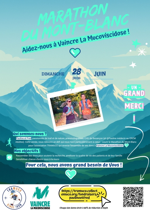 Pauline, Médecin dans notre CRCM s'est lancé le défi avec son mari de courir le Marathon du Mont-Blanc le 28 juin prochain à Chamonix en tant que dossards solidaires pour la communauté TRAMUCO.