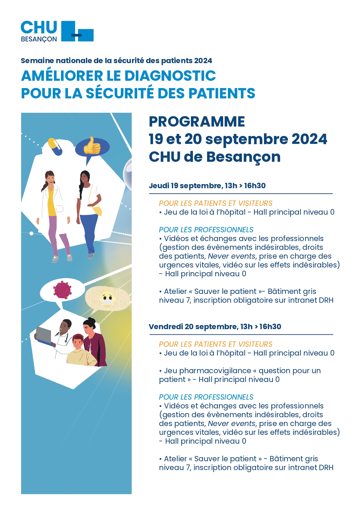 La nouvelle édition de la semaine de la sécurité des patients se déroule du 16 au 20 septembre avec pour thème « Améliorer le diagnostic pour la sécurité des patients ». Les professionnels du CHU de Besançon se mobilisent autour de cette campagne nationale avec des stands d’information jeudi 19 et vendredi 20 après-midi dans le hall de l’hôpital. Le public pourra participer à des ateliers instructifs et mieux comprendre comment contribuer à la sécurité des patients.