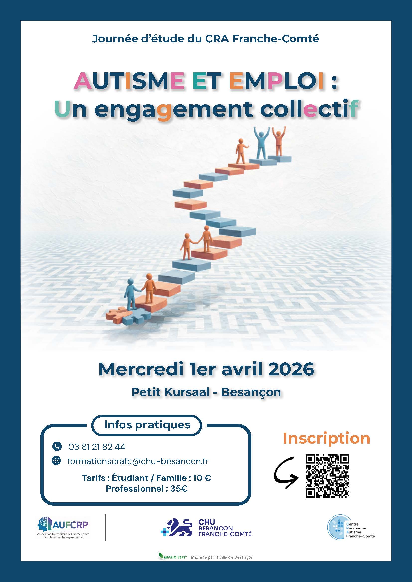 Dans cette continuité, le CRA Franche-Comté propose, le 1er avril 2026, au Petit Kursaal de Besançon, une journée de réflexion consacrée aux enjeux liés à l’emploi des personnes avec un trouble du spectre autistique (TSA). Cette rencontre a pour objectif d’apporter un éclairage sur les conditions d’accès et de maintien dans l’emploi, tout en mettant en valeur les pratiques et initiatives régionales. Elle s’appuiera sur des témoignages croisés de personnes concernées, de familles, de professionnels et d’employeurs.