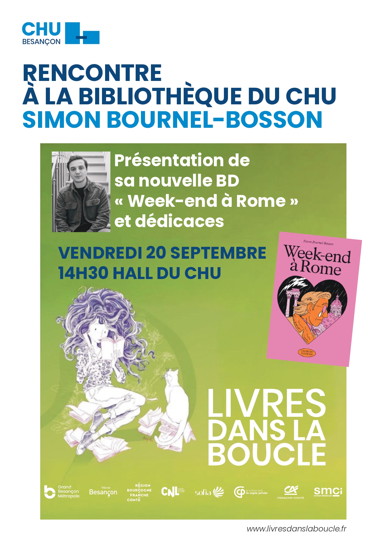 Vendredi 20 septembre à 14h30, une rencontre avec Simon Bournel-Bosson autour de sa nouvelle BD Week-end à Rome, est organisée par la Bibliothèque du CHU dans le hall de l’hôpital Jan-Minjoz. Cet évènement se déroule dans le cadre du festival littéraire Livres dans la Boucle.