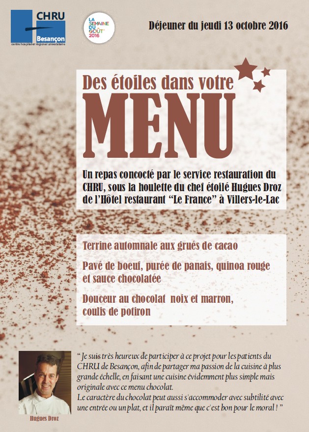 Le Comité de liaison alimentation nutrition (CLAN) et l'Unité de production culinaire du CHRU ont sollicité pour cette 2ème édition Hugues Droz, chef étoilé de l'hôtel-restaurant Le France à Villers-le-Lac, qui a immédiatement adhéré au projet et proposé le thème du chocolat pour ce menu haut de gamme.
