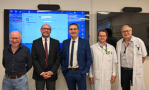 De gauche à droite : Pr Frédéric Aubert, chef du service de chirurgie pédiatrique, Thierry Gamond-Rius, directeur général du CHU de Besançon, Dr David Lebel, Dr Jeremie Nallet et Dr Daniel Amsallem, chef du pôle médico-chirurgical de l’enfant et de l’adolescent.