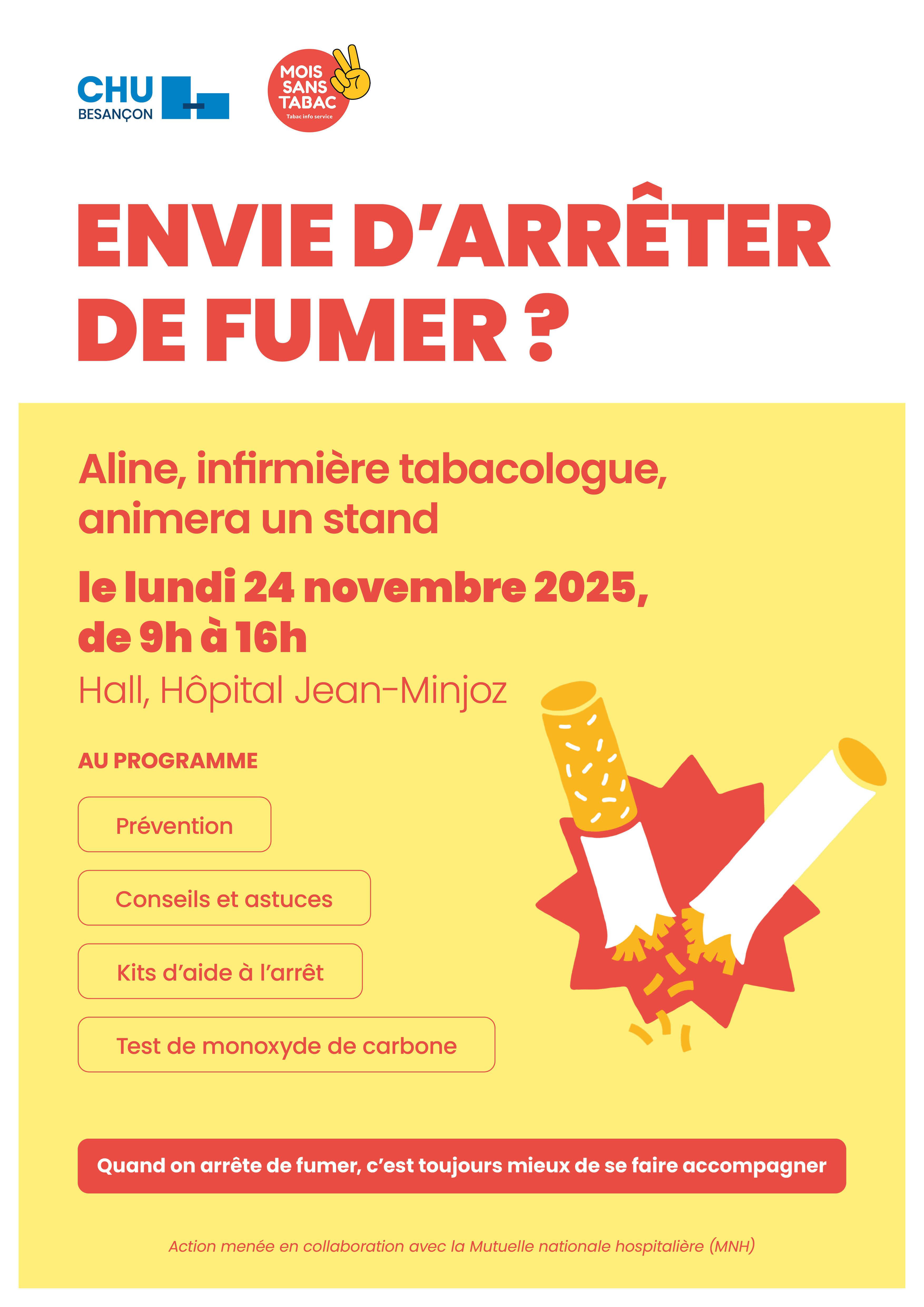 Envie d'arrêter de fumer ? Dans le cadre de la campagne nationale "Mois sans tabac", Aline, infirmière tabacologue animera un stand le lundi 24 novembre, de 9h à 16h, dans le hall de l'hôpital Jean-Minjoz.