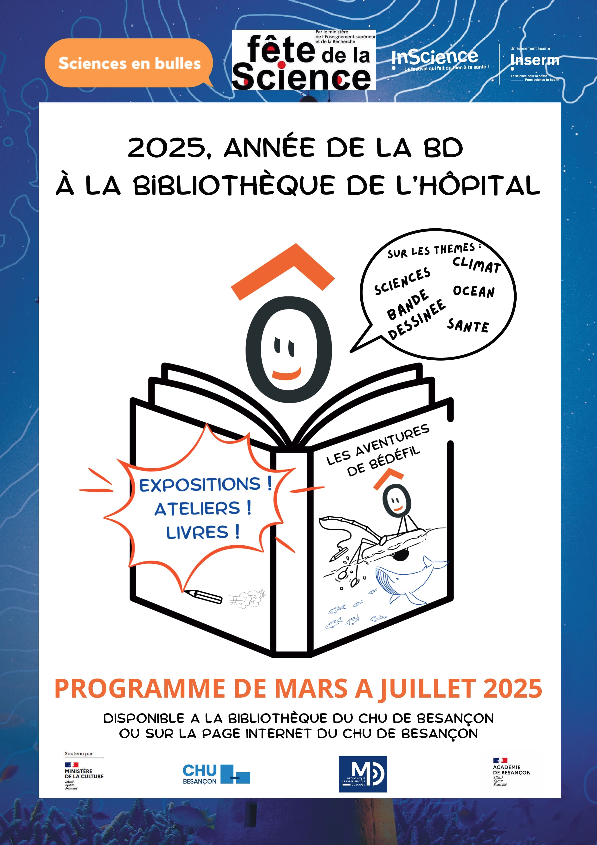 De mars à juin 2025, la bibliothèque de l’hôpital propose des expositions, des ateliers et des sélections de livres autour des thèmes de la bande-dessinée et de la fête de la science sur l’océan.