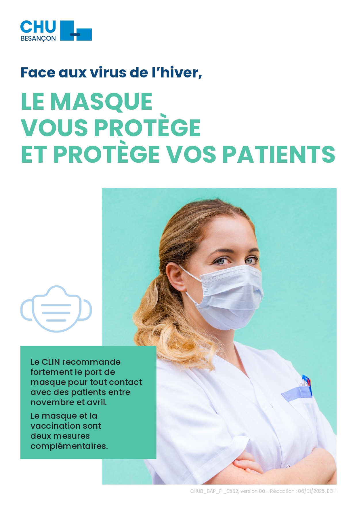 L’incidence des cas d’infections respiratoires aiguës virales étant en nette diminution, l’obligation du port de masque au CHU de Besançon est désormais levée. Toutefois, conformément à l’avis du Comité de lutte contre les infections nosocomiales (CLIN), la recommandation du port systématique du masque chirurgical pour tous les professionnels lors des contacts avec des patients est maintenue jusqu’au 31 mars 2025.