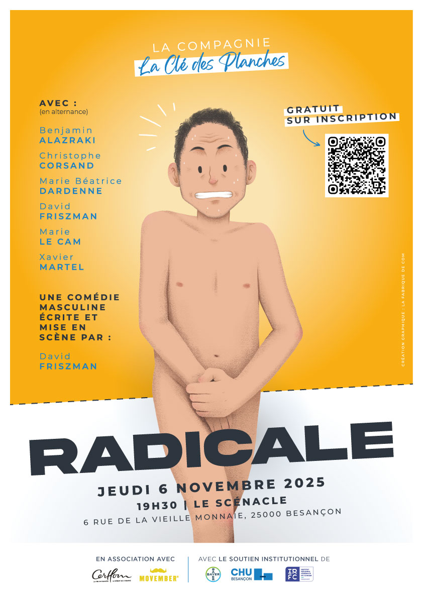 À l'occasion du mois de sensibilisation à la santé masculine, l'Institut régional fédératif du cancer (IRFC) de Franche-Comté organise, aux côtés du CHU de Besançon, une journée de sensibilisation le 6 novembre prochain. Au programme : stand, pièce de théâtre et échange avec les professionnels de santé à l'issue de la représentation.