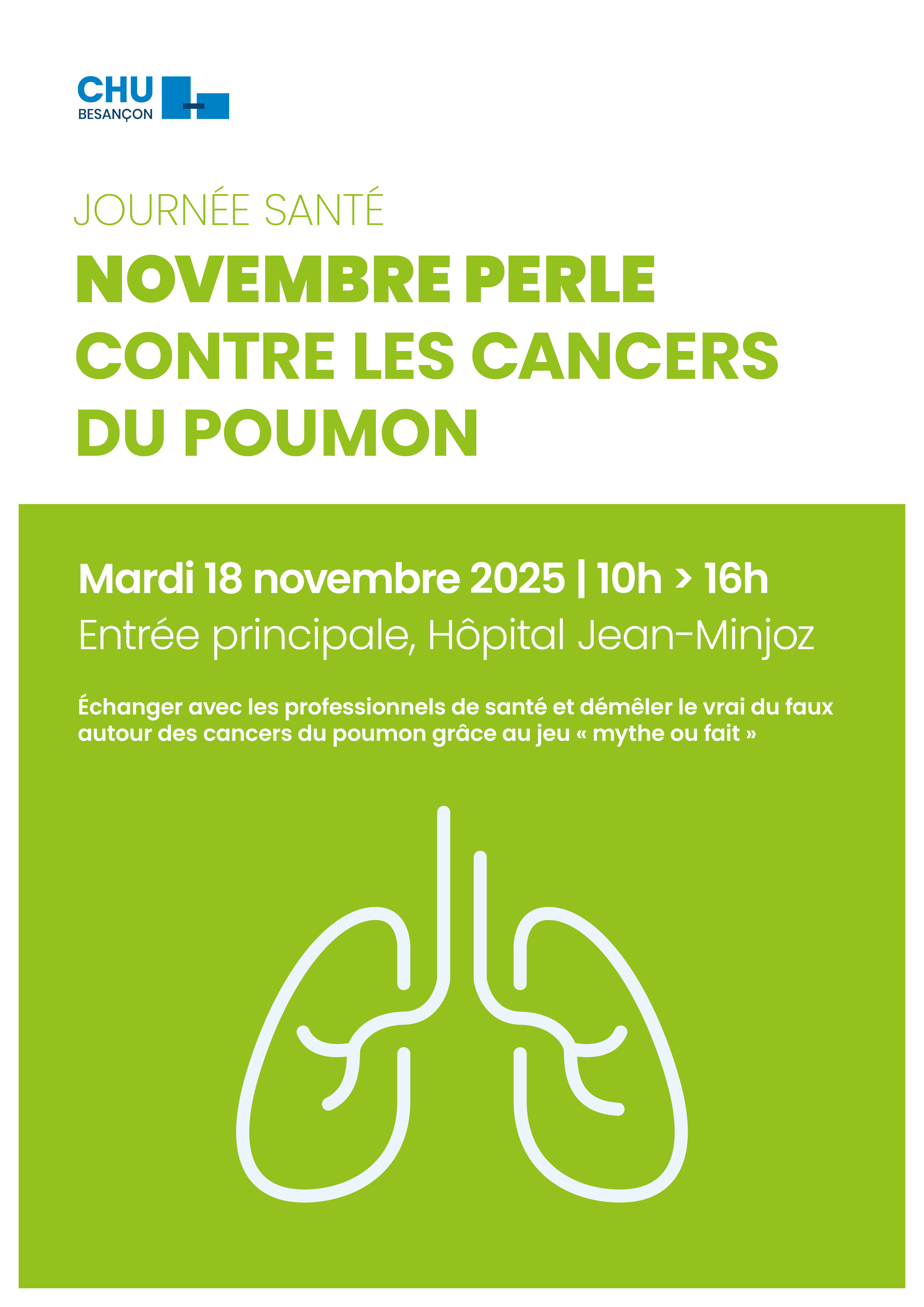 Le mardi 18 novembre, le service de pneumologie sera mobilisé pour informer, encourager le dépistage précoce et lutter contre les idées reçues concernant la survenue d'un cancer du poumon. Entrée principale de l'hôpital Jean-Minjoz, 10h-16h