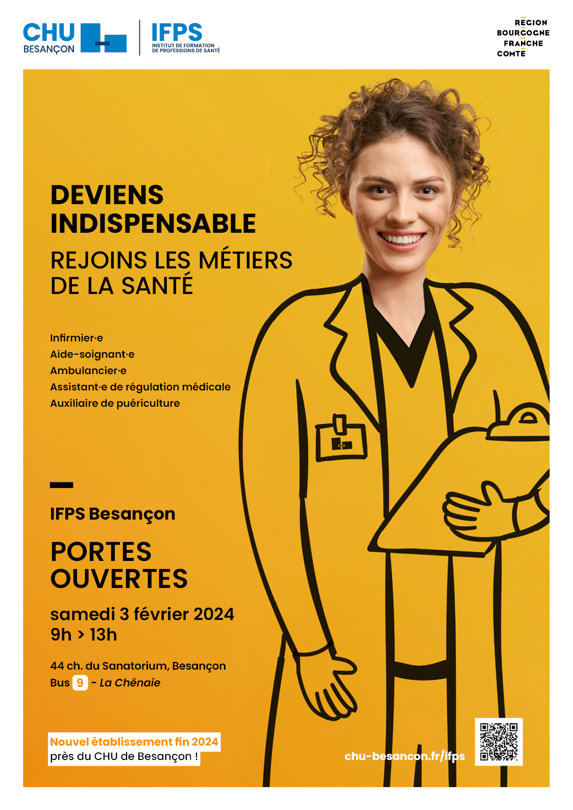 L'institut de formation de professions de santé (IFPS) du CHU de Besançon renouvelle sa journée portes ouvertes le samedi 3 février de 9h à 13h afin de faire découvrir les cursus proposés par l’IFPS, dont six formations initiales : aide-soignant, ambulancier, assistant de régulation médicale, auxiliaire de puériculture et infirmier.