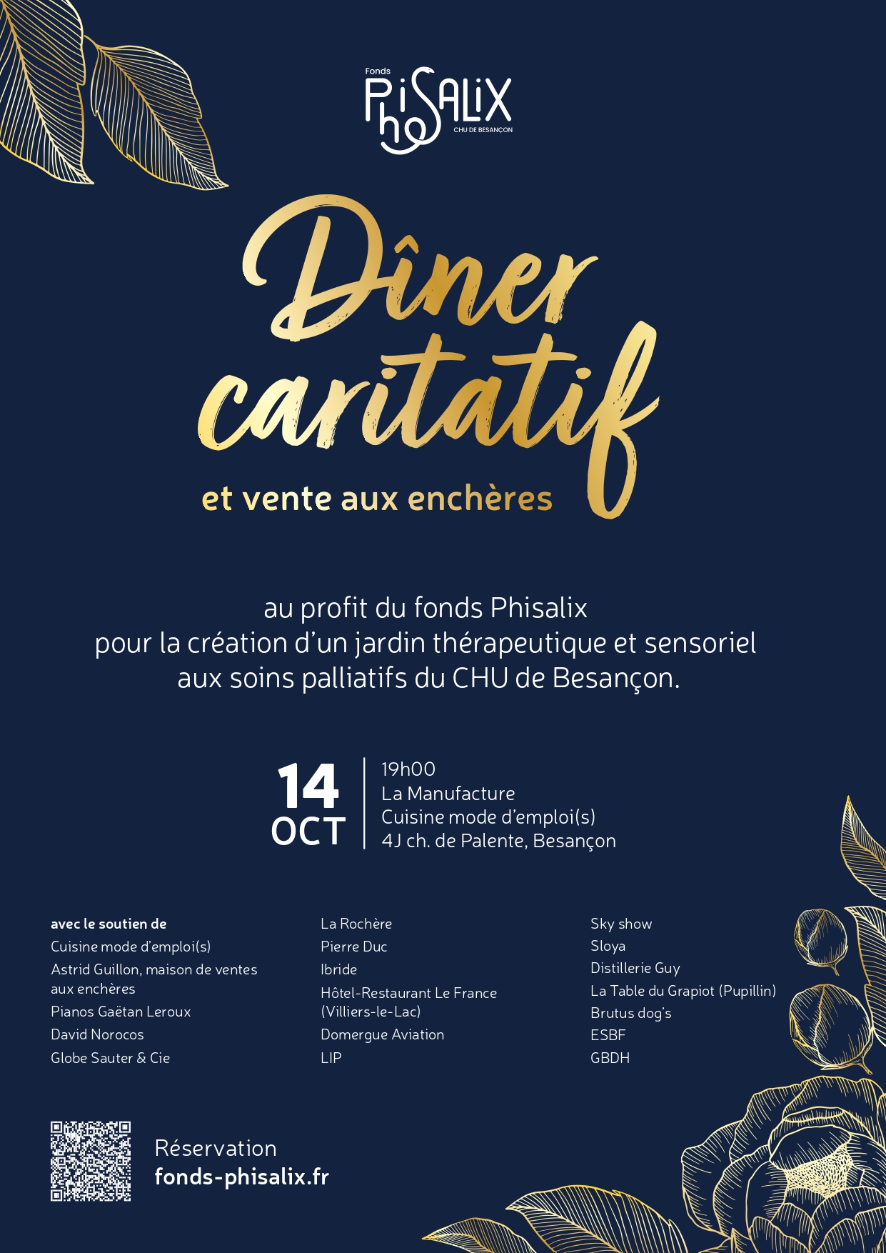 Le Fonds Phisalix organise sa première grande soirée caritative le mardi 14 octobre 2025 à 19h00 à la Manufacture – Cuisine Mode d’Emploi(s) à Besançon, dans les anciens locaux de l’horlogerie LIP. Tous les bénéfices de la soirée seront reversés au projet de création d’un jardin thérapeutique et sensoriel aux soins palliatifs du CHU de Besançon.