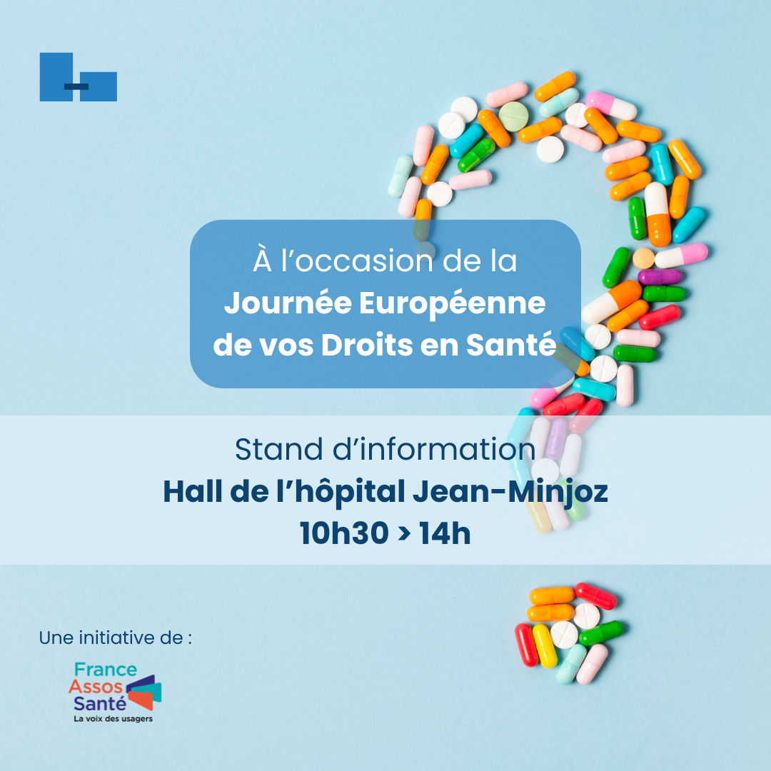 À l’occasion de la Journée Européenne de vos droits en santé, le réseau France Assos Santé sera présent le lundi 19 mai à l’hôpital Jean-Minjoz.