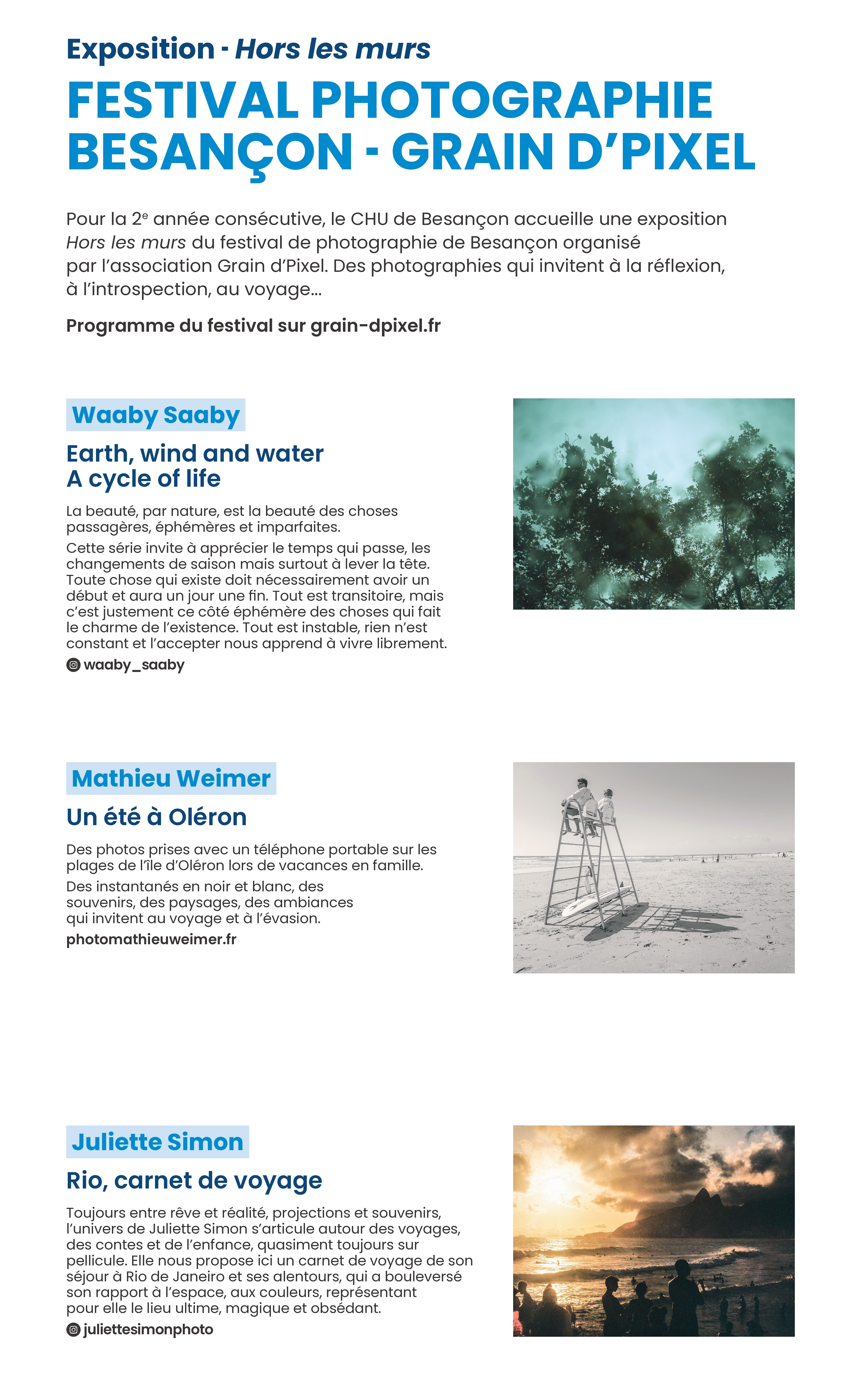 - Trois photographes du festival Grain d’Pixel exposés au CHU