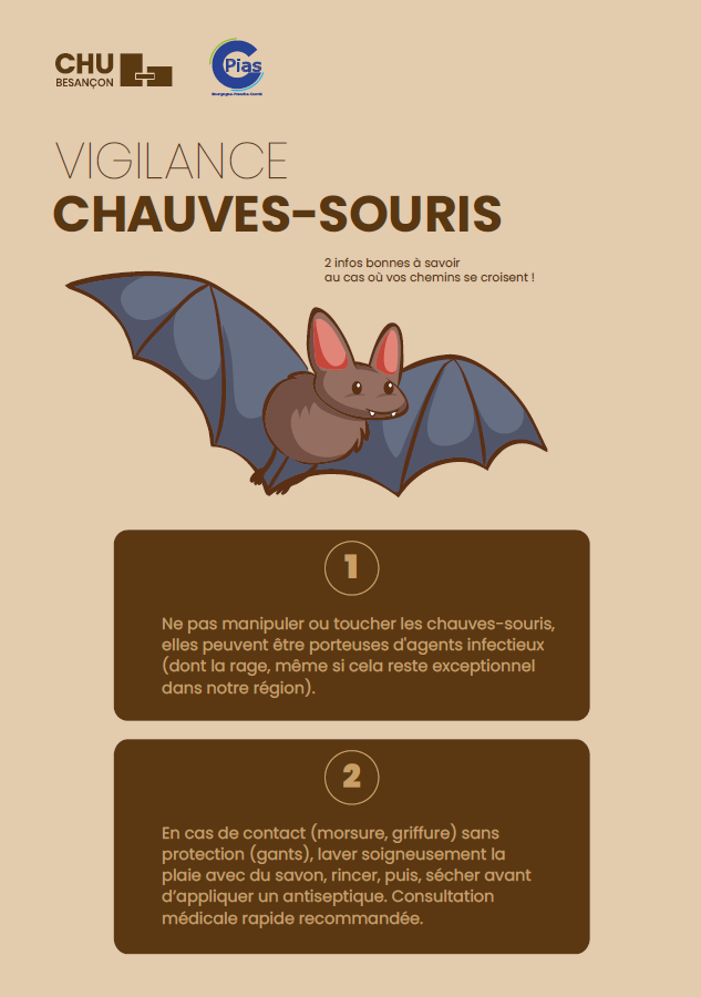 Les chauves-souris peuvent être porteuses d'agents infectieux (dont la rage même si plus exceptionnelle sous nos contrées).