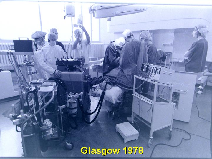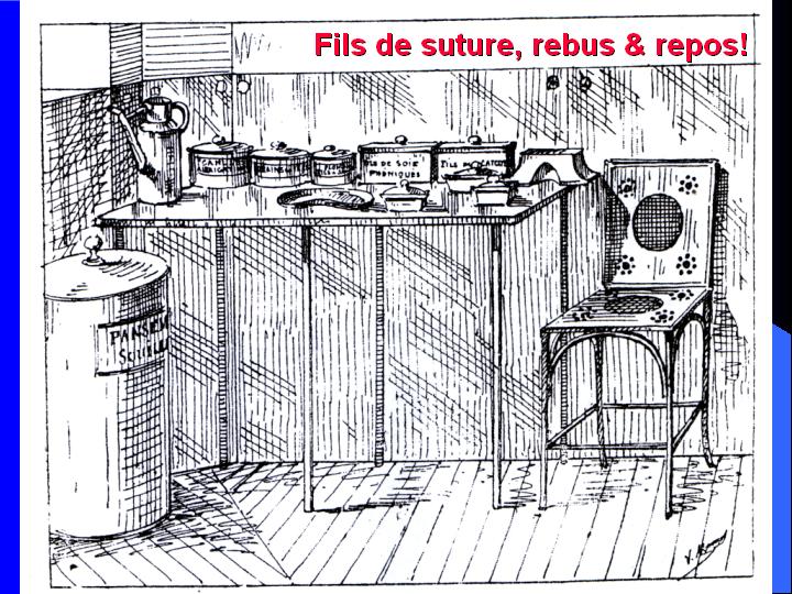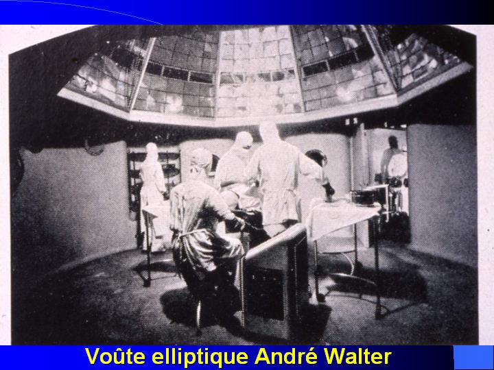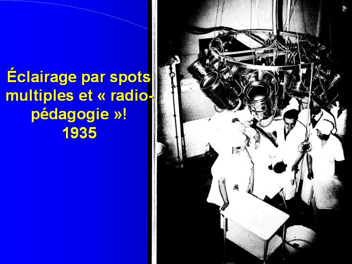 L'éclairage avait fait des progrès, cependant, avec l'arrivée au début du siècle dernier de la fée Electricité. De lourdes suspensions diffusaient une lumière intense et très calorigène, tout en retenant des poussières locales parfois difficiles à exclure totalement au cours des opérations. Cette dernière particularité semblait imposer dans bien des esprits de bouter hors des blocs les observateurs et les sources lumineuses sans négliger pour autant la pédagogie ni l'éclairage. |