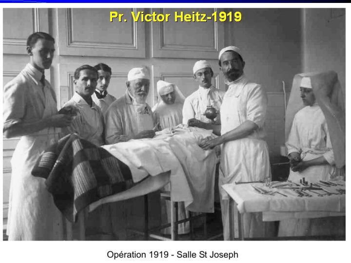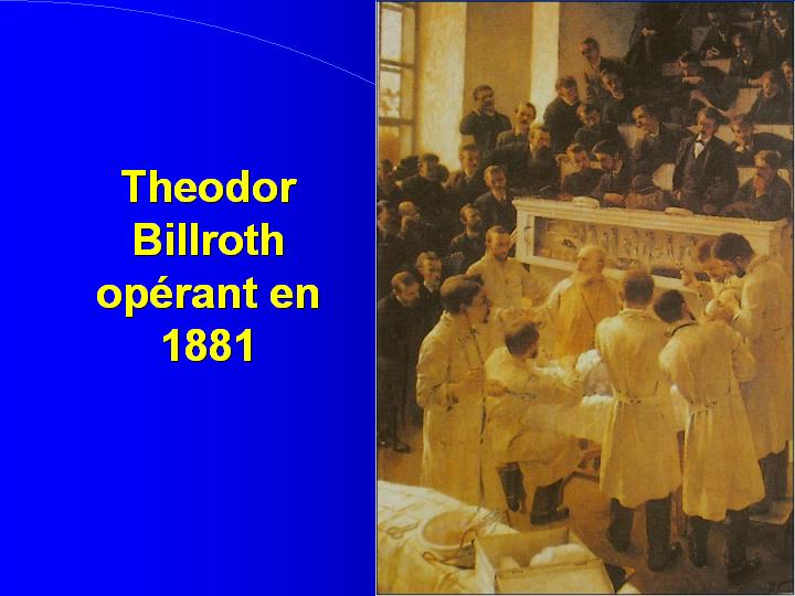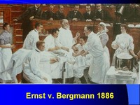 fonctionnels assez tard pour certains d'entre eux ! Et nous avons en tête la représentation de grands maîtres de la chirurgie entourés d'une multitude : Th. Billroth en 1881 à Vienne, Ernst von Bergmann en 1886 à Berlin, la pratique de l'Uni-Klinik de Frankfurt en 1933. |