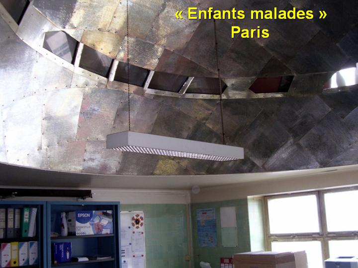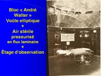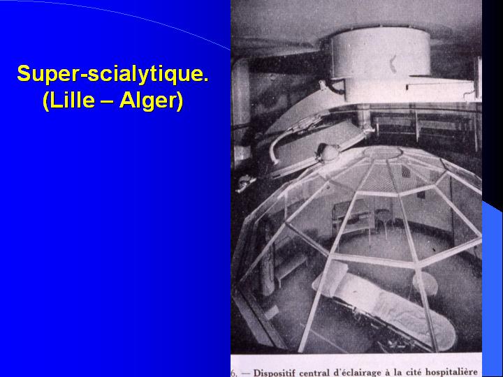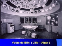 partait d'une idée similaire : Au-dessus de la salle d'intervention un hémisphère, ajouré pour permettre l'observation du champ opératoire, comportait une soixantaine de projecteurs puissants qui s'allumaient par groupe en fonction du désir de l'opérateur et par déplacement d'un plot stérile sur une tablette de contacts. Les deux dispositifs équipaient plusieurs blocs opératoires de l'Hôpital Universitaire d'Alger et de la cité Hospitalière de Lille, que nous avons bien connus. |