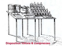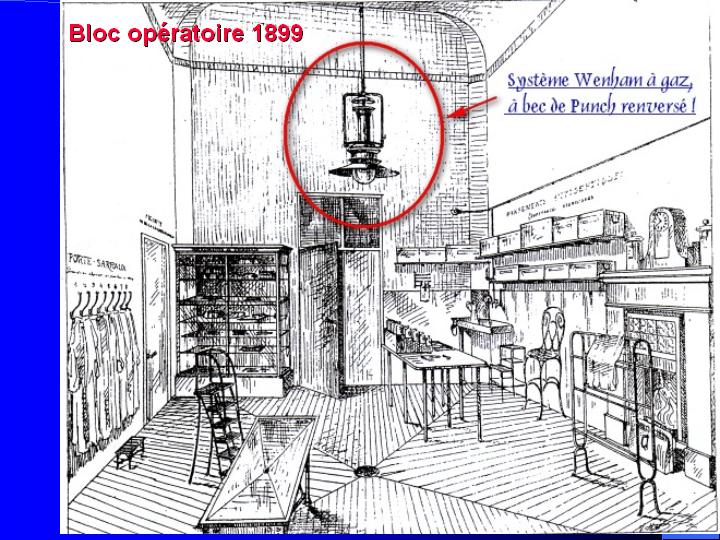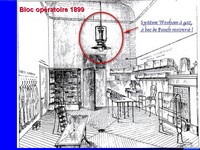 A Lyon, Antonin Poncet inaugurait en 1889 un bloc opératoire devant allier impératifs d'asepsie et d'éclairage efficace au gaz, ce qui n'alla pas sans quelque problème et explosion ! Ce bloc opératoire, issu d'une étude préalable méticuleuse menée sous des latitudes variées et de l'expérience du champ de bataille de 1870, cumulait les particularités suivantes : sas d'entrée et changement d'habits des intervenants, murs couverts de glaces faciles à arroser à l'aide de substances nettoyantes, tables et étagères en métal et verre, drainage déclive au sol permettant la disparition rapide des " sanies ", disposition d'eau stérilisée pour le lavage des mains et des avant-bras, présence exclusive du personnel nécessaire au bon accomplissement de l'opération. La lumière puissante d'un système Wenham au gaz, à bec de Punch renversé, complétait l'éclairage produit par une baie occupant tout un mur et orientée plein Est. |